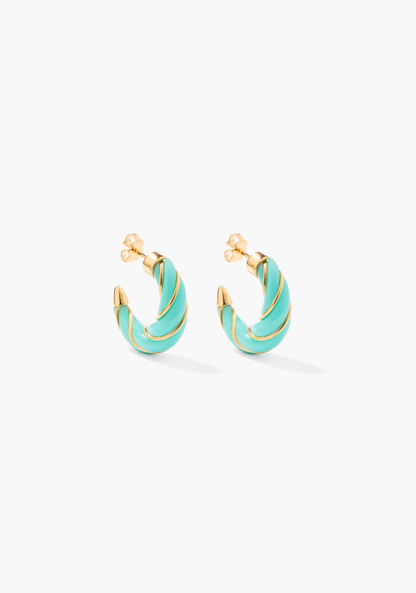 La famille Diana est de la partie avec une série inédites de bagues et de créoles aux entrelacs délicatement surlignés de métal doré, proposées en vert, en noir et dans une délicate nuance d’ivoire.